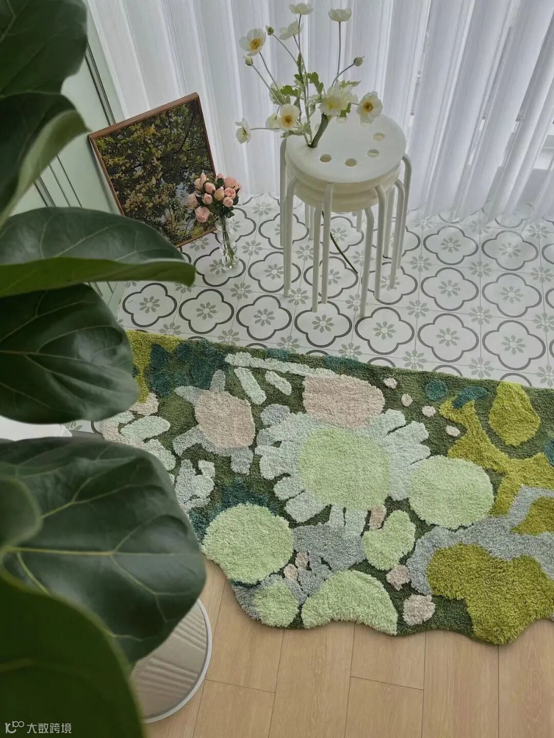 白色的家具、绿白相间的地毯