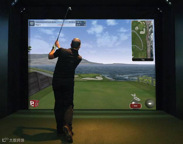 这套高尔夫模拟系统,就是几米外的一块大屏幕,上面可以显示各种地形、地貌、果岭、沙坑。当把球打在屏幕上时,真球就落在地上,但是屏幕上会显示一个虚拟的球,它根据打球的力度在虚拟的草地上滚动。那种感觉就像打电子游戏,第一次打就一发而不可收。