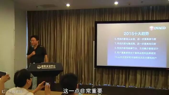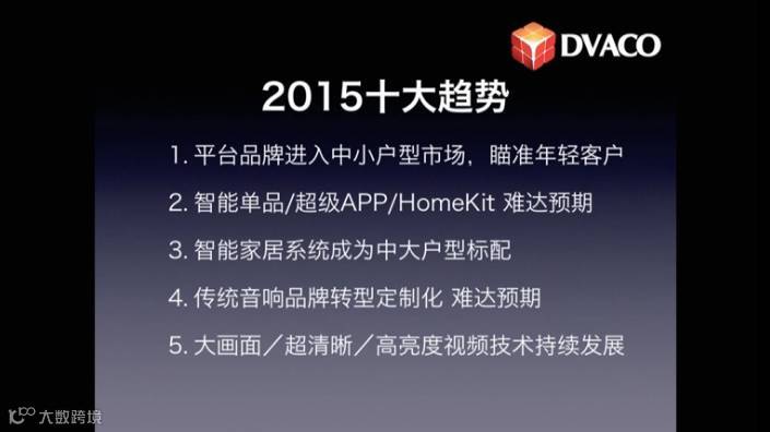 接着邢罡先生继续对2015年的十大趋势进行预测和展望,他认为平台品牌进入中小型市场,瞄准年轻客户、智能家居系统成为中大户型标配、大画面、超清晰、高亮度视频技术持续发展、传统的影音从业者,进一步提高参与度、传统的装饰装修行业,主动融合智能设计、从关注技术和市场转向关注方案和用户等等现象将会愈演愈烈。