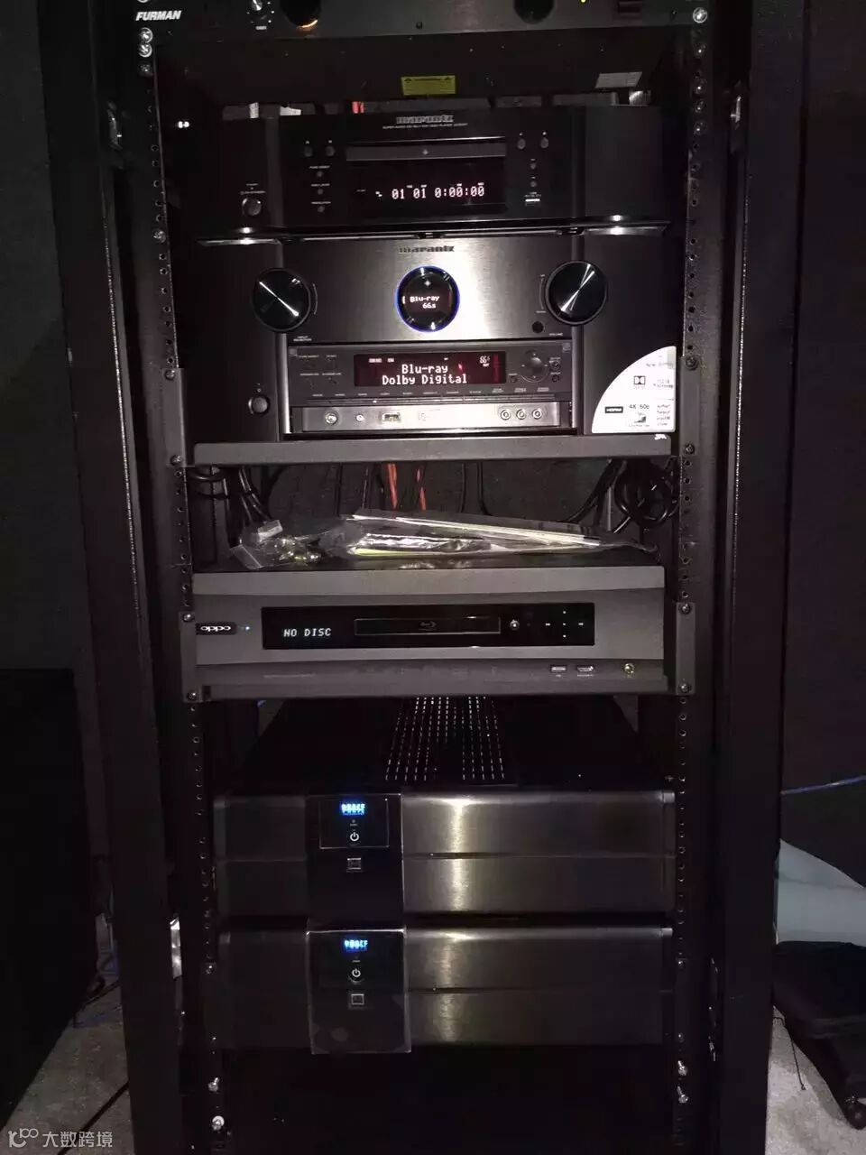DEMO室里是一套7.4.4配置的dARTS帝驰全景声影院,在原有的7.2的基础上增加了4只低音炮,同时增加了4只全景声吸顶音箱,在机柜中我们可以看到,采用的是Marantz马兰士前级以及两台DP4000作为后级,从而实现了强大的dARTS帝驰全景声效果。