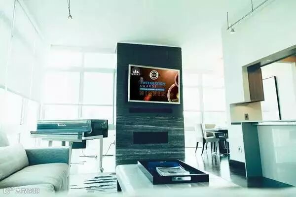 除了这套音乐系统,房主还加装了智能灯控照明、空调地暖、监控摄像安防等智能设备。户主还选择了一台能与智能家居系统连接的65寸高清镜面电视,将它镶嵌在主客厅壁炉的上方,镶嵌的框架是从智能公司定做的,当用户按下一个按钮,电视就会从墙面里出来并放置到合适的视角位置,看完电视后,可以一键返回镶嵌到墙内,美观的同时也保证了电视的安全。这种将镜面电视与智能框架的无缝衔接体现了集成安装商的别具匠心。