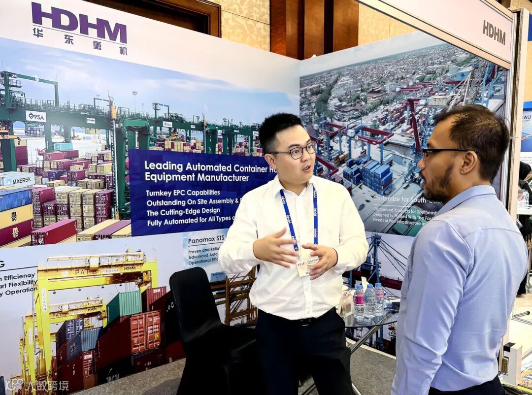 展会期间,华东重机团队接待了多位东盟地区的港口运营商、船务公司及重要供应商代表,就自动化港机产品的技术特点、应用场景及整体解决方案展开深入交流。通过详细介绍公司在港口设备领域的研发成果与项目经验,让各方充分了解到华东重机的发展现状与未来战略方向。