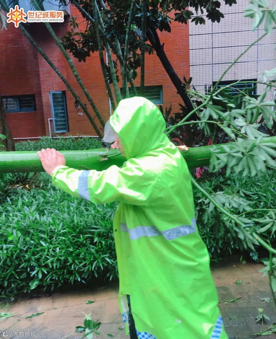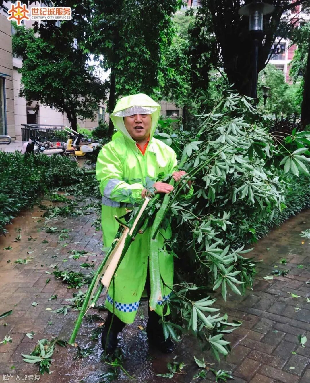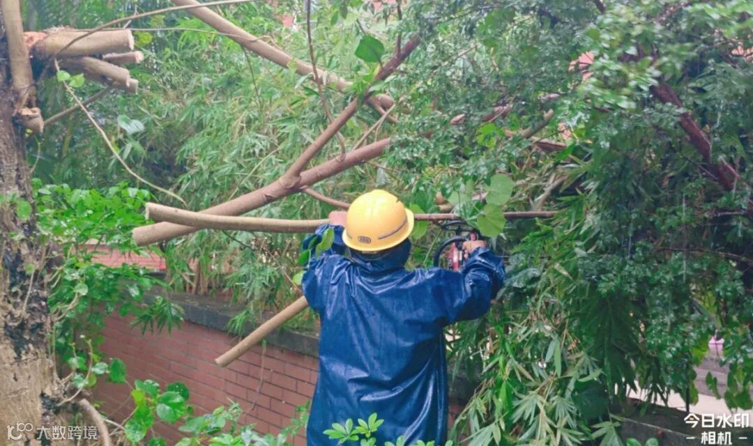 世纪城服务人扛起电锯冲进雨幕,