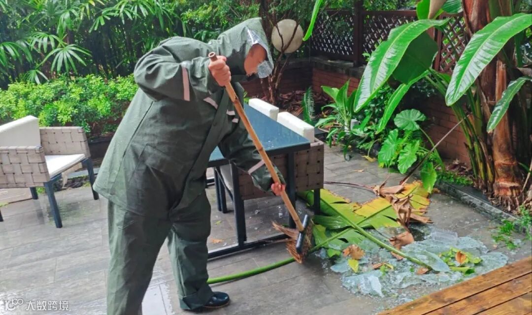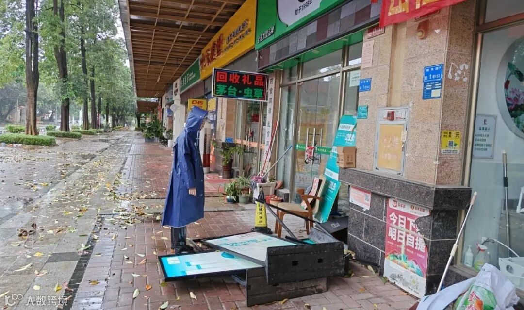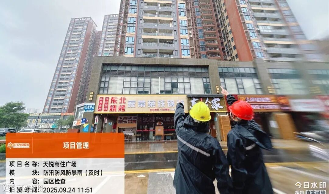 在园区内外,世纪城服务人仰头细查外立面,发现一处松动的广告牌立即围挡警示;面对被风吹倒地的商铺物品,他们立即安排人员清理并加固。