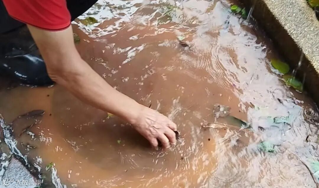 铁锹无法伸入,他们直接蹲跪在积水中,