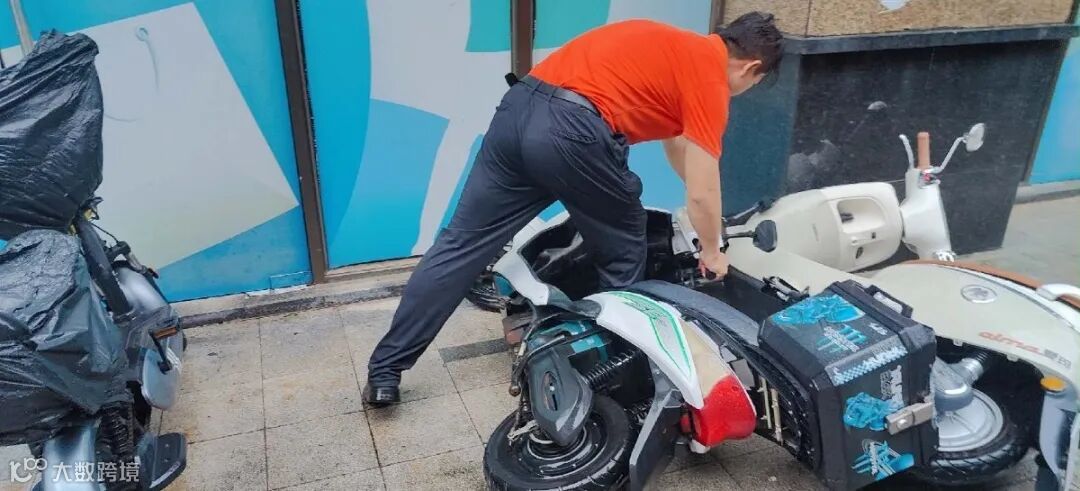 车棚里,他们一一扶起被吹倒的电动车。