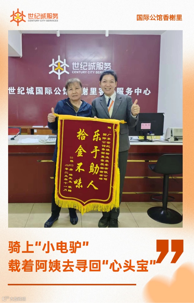 国际公馆香榭里业主杨阿姨不慎将存有重要信息的手机遗失在小区外。管家谢有娣一边安抚老人,一边不断拨打电话,最终骑着电动车载着阿姨在另一个小区寻回手机。