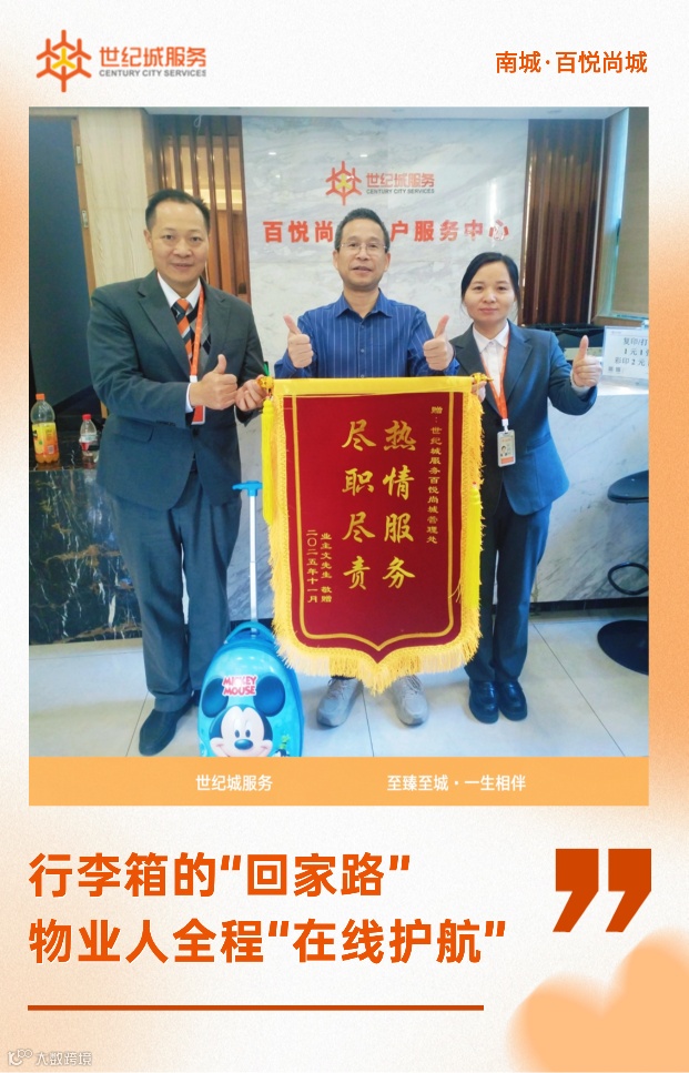 百悦尚城业主文先生不慎将装有重要证件的行李箱遗落地下车库。管家肖金秀立即群发通知,秩序维护领班邓冬华、蓝国维火速调取监控追踪,最终物归原主。