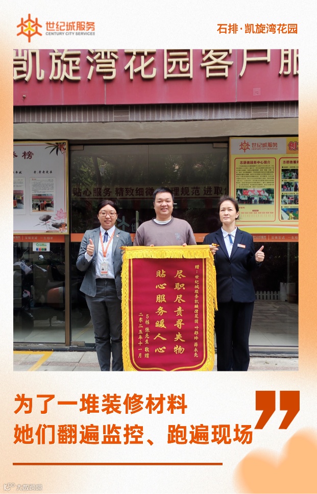 石排·凯旋湾花园业主张先生的装修材料不慎遗失。管家叶彩玲与调度员薛永先默契配合,一个调取监控逐帧排查,一个现场核实,最终成功寻回。