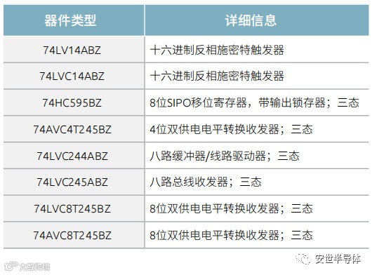 DHXQFN 产品组合具有行业最常见的功能。其中包括施密特触发器、带输出锁存器的移位寄存器、电平转换收发器、八路缓冲器/线路驱动器、八路总线收发器和 8 位双供电电平转换收发器。