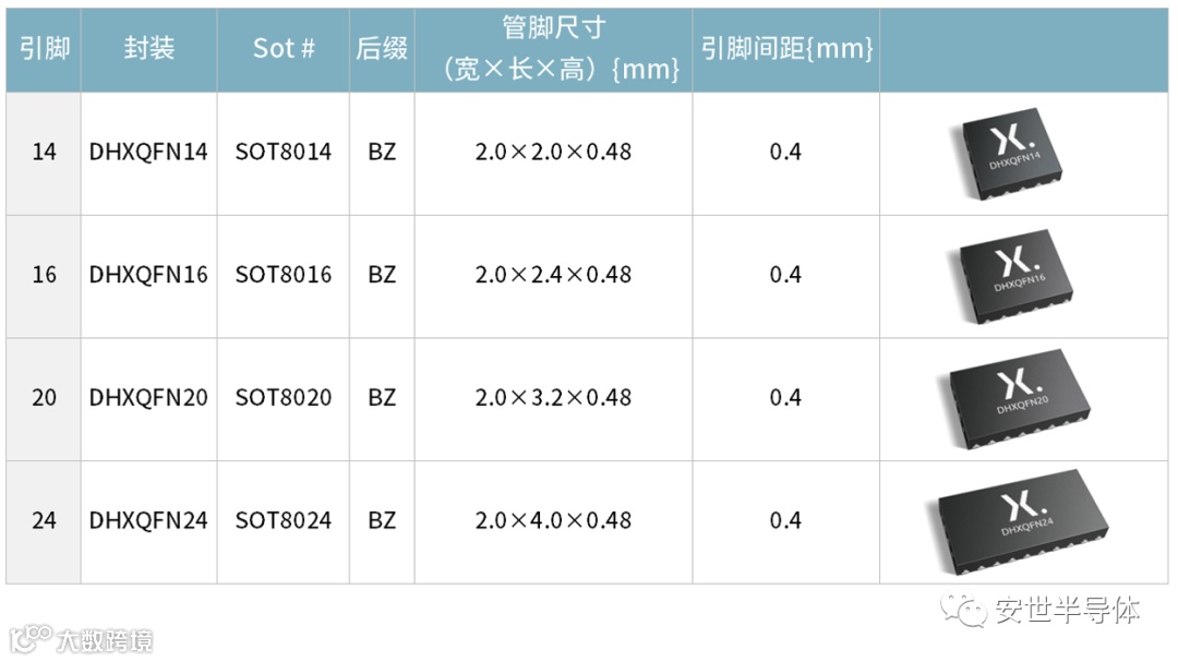 DHXQFN 封装提供 14、16、20 和 24 引脚,间距为 0.4mm,高度为 0.45 mm,以后缀 BZ 标识。