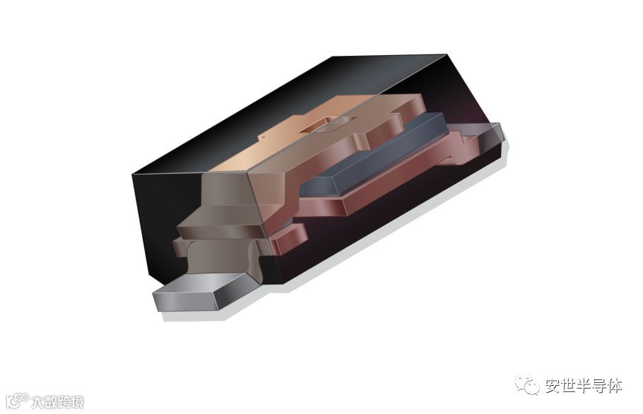 安世半导体夹片式的扁平封装(CFP)设计的热阻低,可以减少热失控。它具有较小的封装尺寸和良好的热性能,可与SMA和SMB等传统的表贴设计相媲美。与焊线封装相比,关键设计区别在于使用坚固的铜夹片连接芯片来降低热阻。该设计还具有降低电阻和封装电感的优势。这种较小的尺寸封装可用于平面和Trench肖特基二极管。在肖特基整流器二极管中,CFP设计可以将二极管移出热失控危险区域。