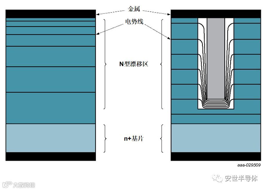 图2:平面肖特基整流器(左)和反方向Trench肖特基整流器(右)中的等势线。
