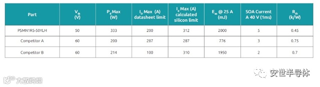 电池隔离 MOSFET 通常放置在远离负载的位置,可能遭受非钳位电感尖峰(UIS)。通过优化VDS电压(50 V),使其更接近电池电压(36 V),可帮助将耗散电能减少至少 20%(与 60 VDS 器件相比),并且可以避免潜在的故障。鉴于典型应用经常在恶劣环境下运行,雪崩事件可能很常见。Nexperia(安世半导体)的 PSMN1R5-50YLH 具有 2000 mJ(在 25 A 电流下)的单相雪崩额定值(EAS),能够反复耐受此类事件。