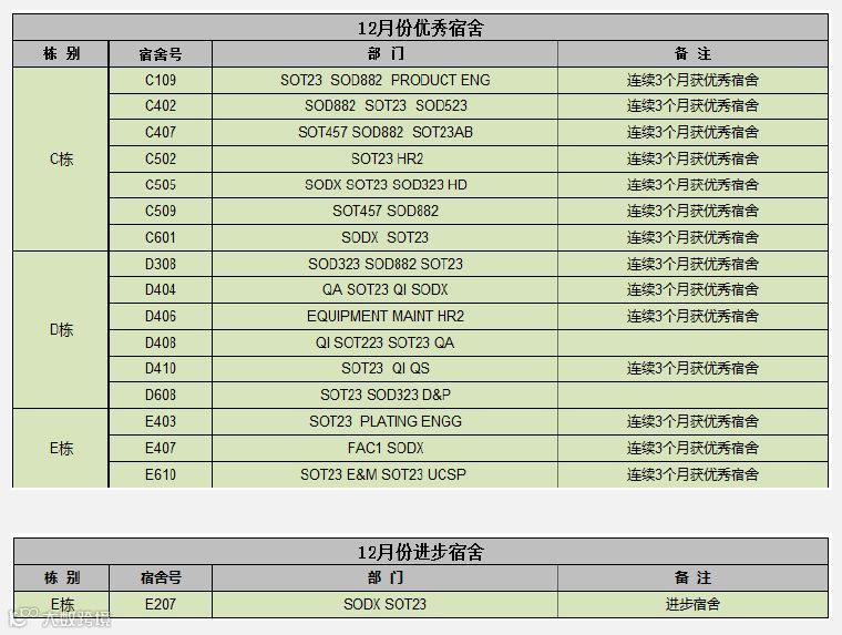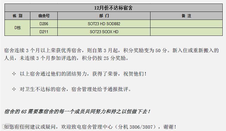 12月份宿舍6S检查评比经过宿舍管理员及宿舍长每日检查的初评、及6S委员会进行月度评估,最后评出优秀宿舍16间,进步宿舍1间,不达标宿舍2间,共有77人获得积分奖励(名单如附件)。宿舍评比结果明细如下: