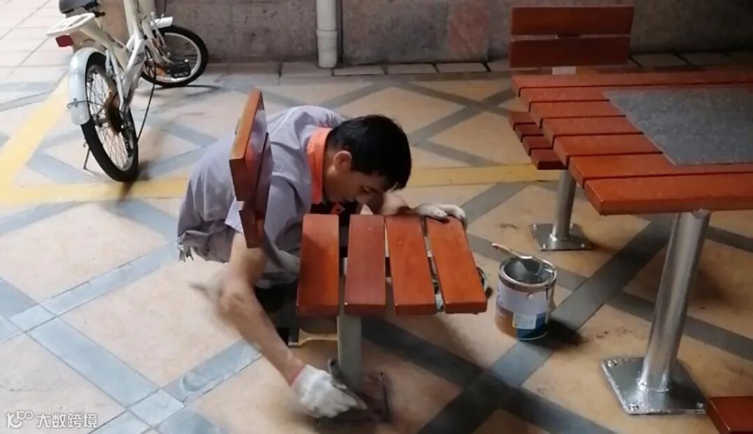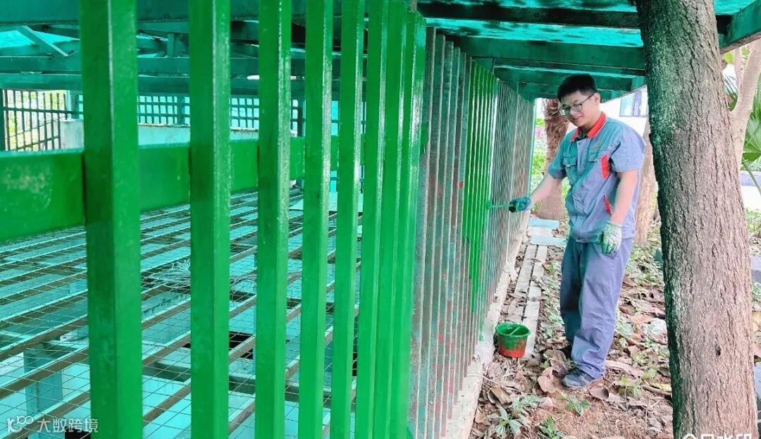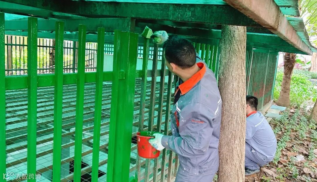 物业工作人员将褪色的围栏