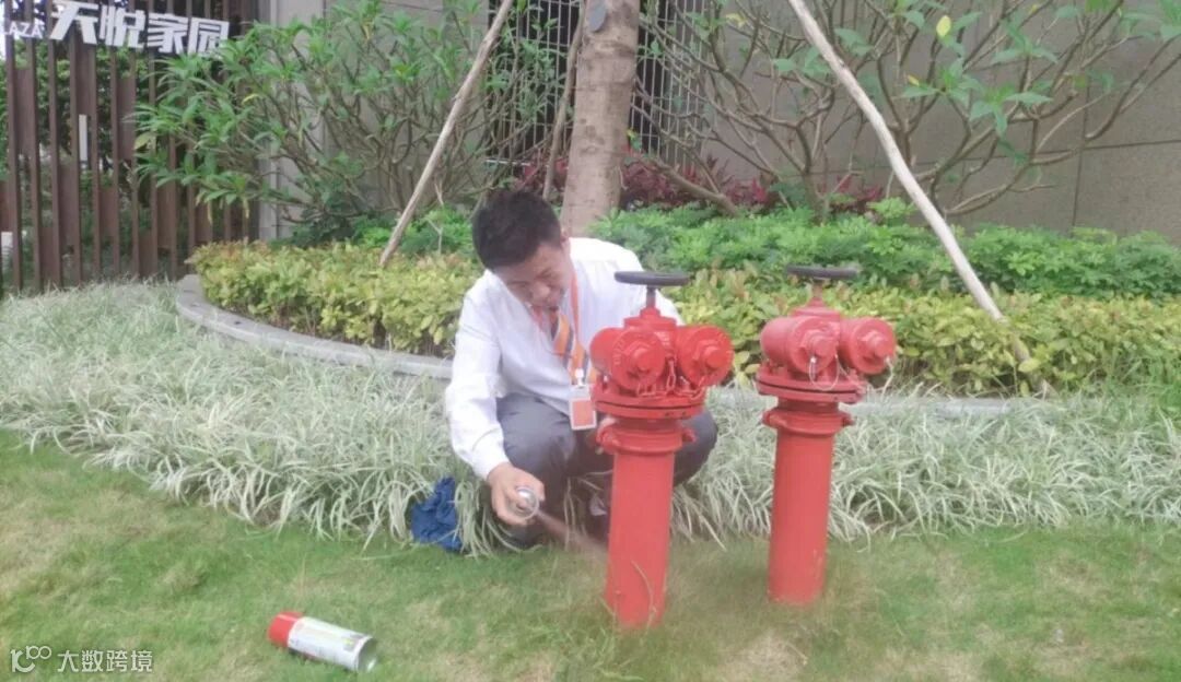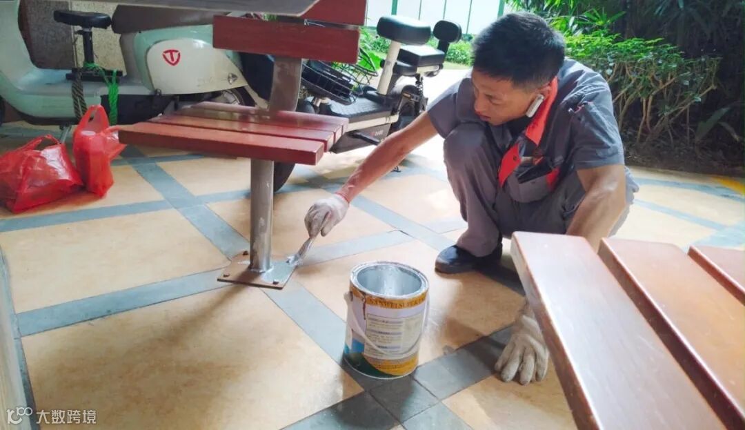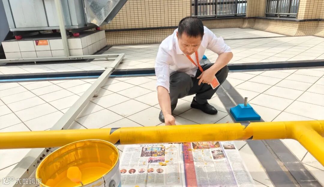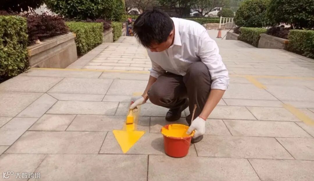 物业工作人员拿起小刷子、提上小漆桶