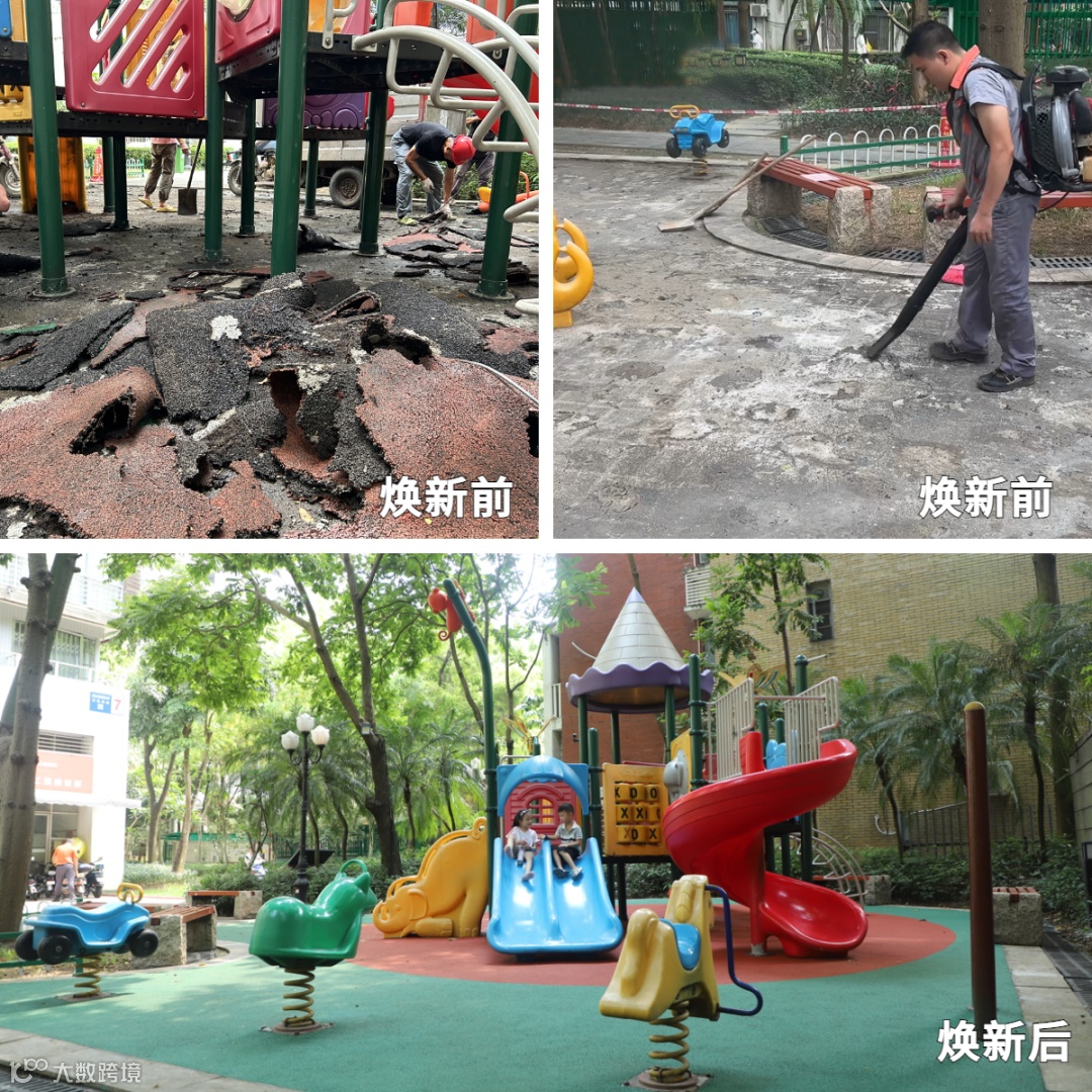 游乐场是孩童的玩乐天地,针对游乐场地面破损问题,物业工作人员安排专业人员完成了7栋游乐场约100平方的地面翻新工作。