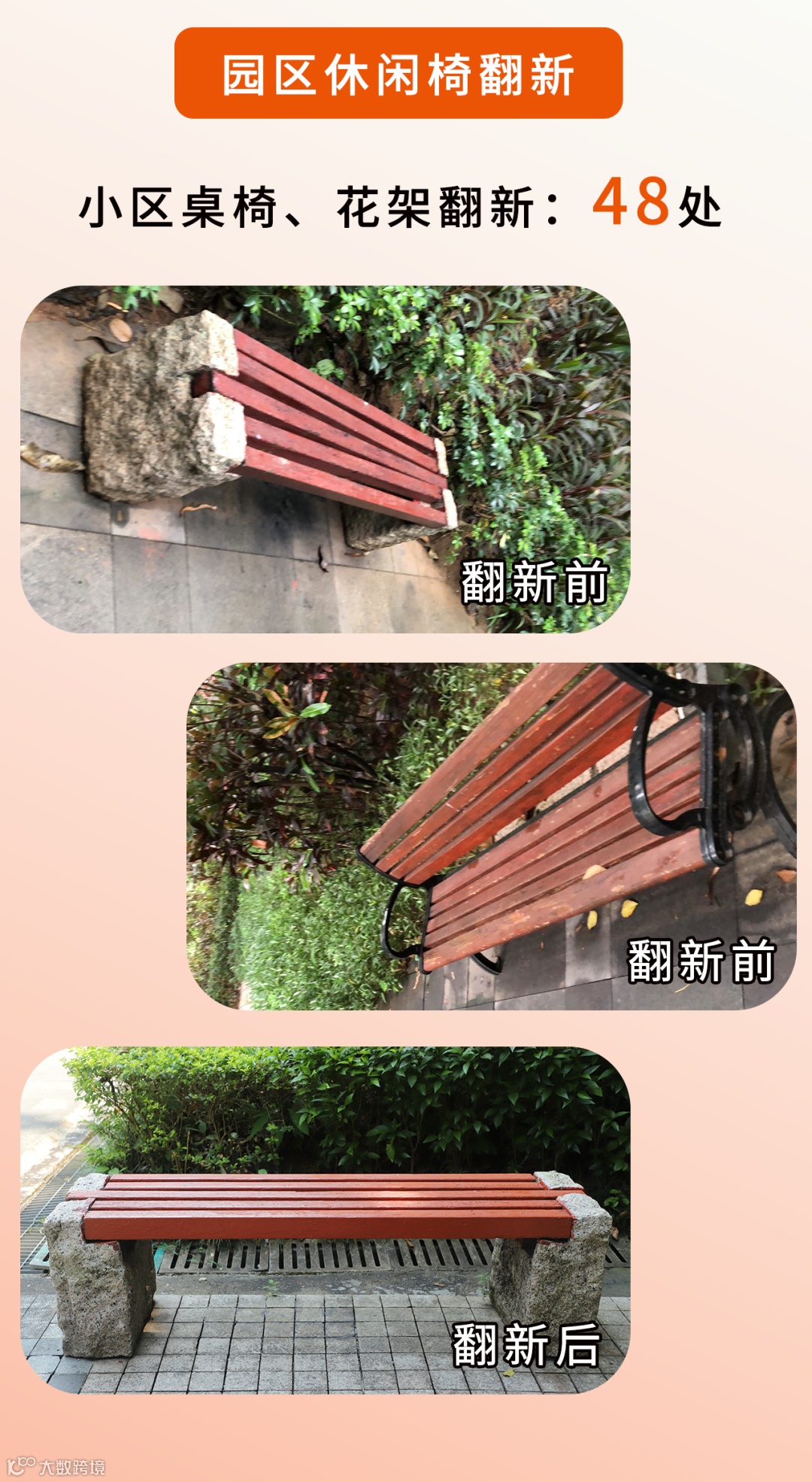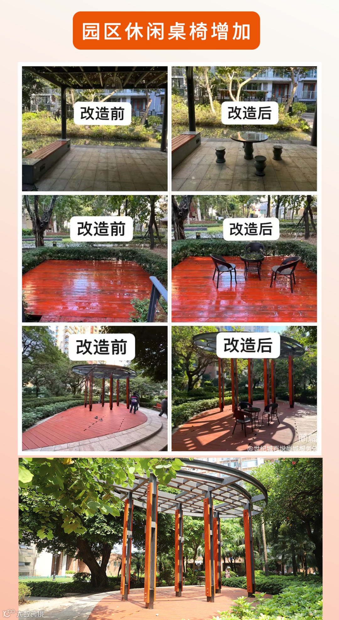 入驻初期,百悦尚城物业团队迅速摸排园区环境、设施设备等现状,并进一步结合实际采取一系列焕新整改举措,提升现场服务品质。让我们一起来看看,物业都做了哪些整改?