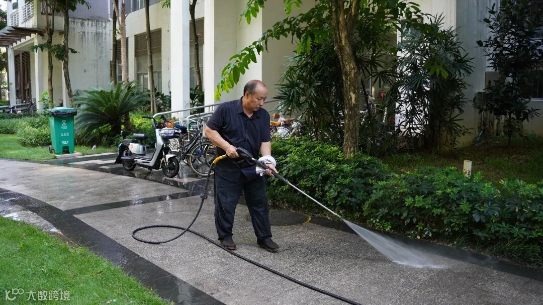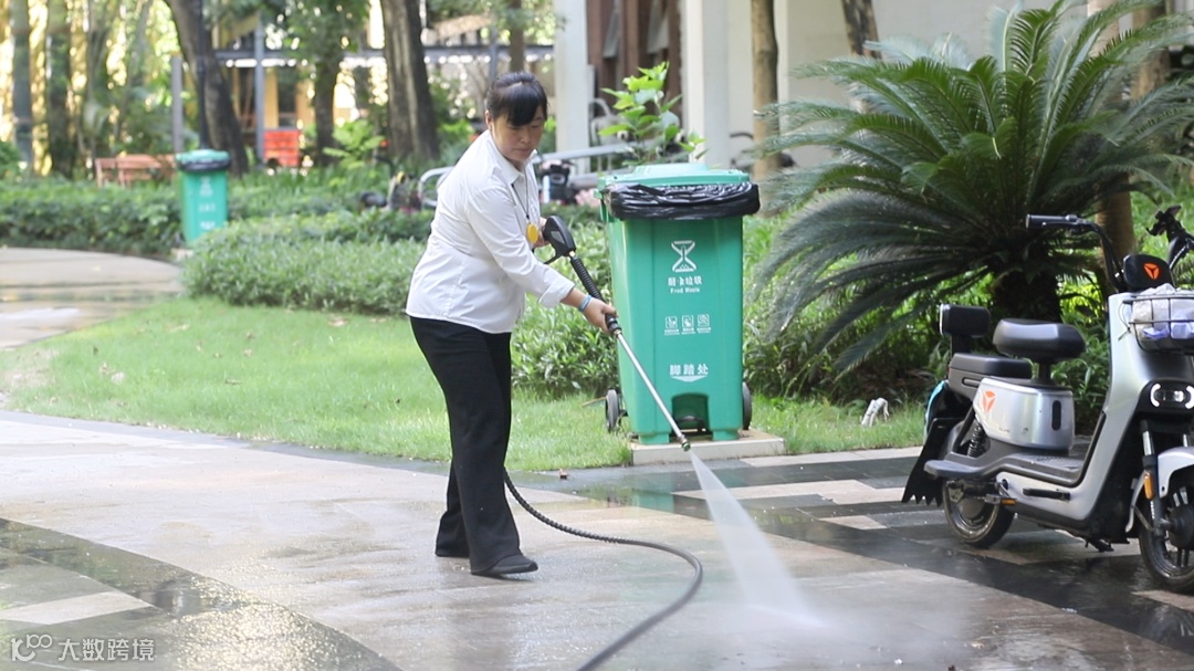 保洁人员使用高压水枪将园区主干道路面、地库沉积下来的污垢冲洗掉,使地面洁净如新,一改往日“灰头土脸”形象,为业主带来归家“一百米”整洁舒适的环境。