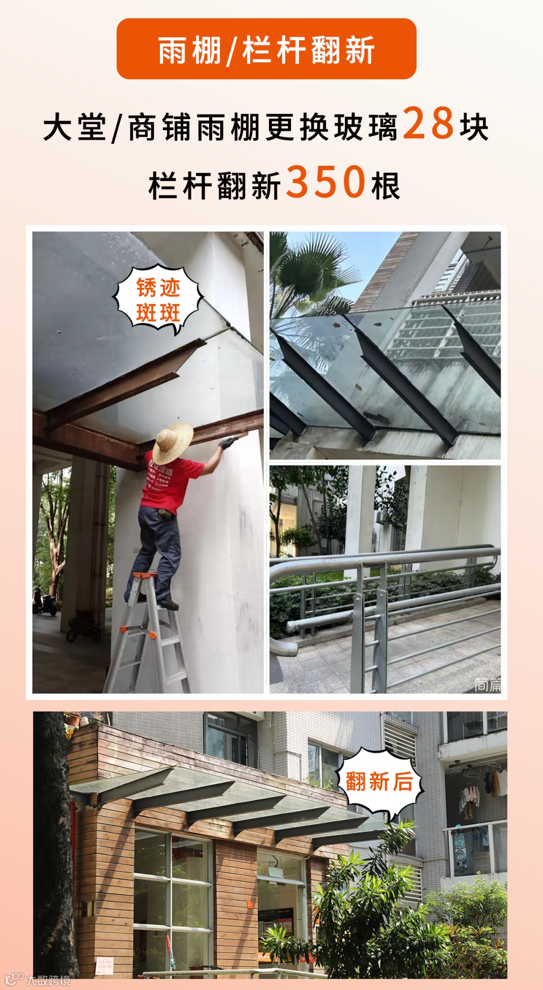 在饱受风吹日晒雨淋以及不明物体的碰击后,小区栏杆、休闲桌椅、花架、井盖、雨棚等纷纷呈现了“伤痕累累”的岁月痕迹,为业户居住、休闲娱乐带来了极大的不便。