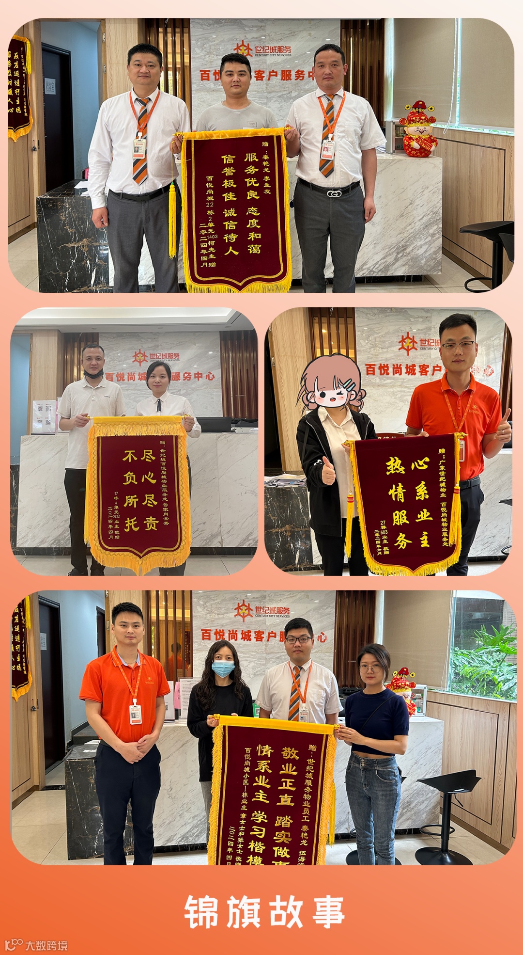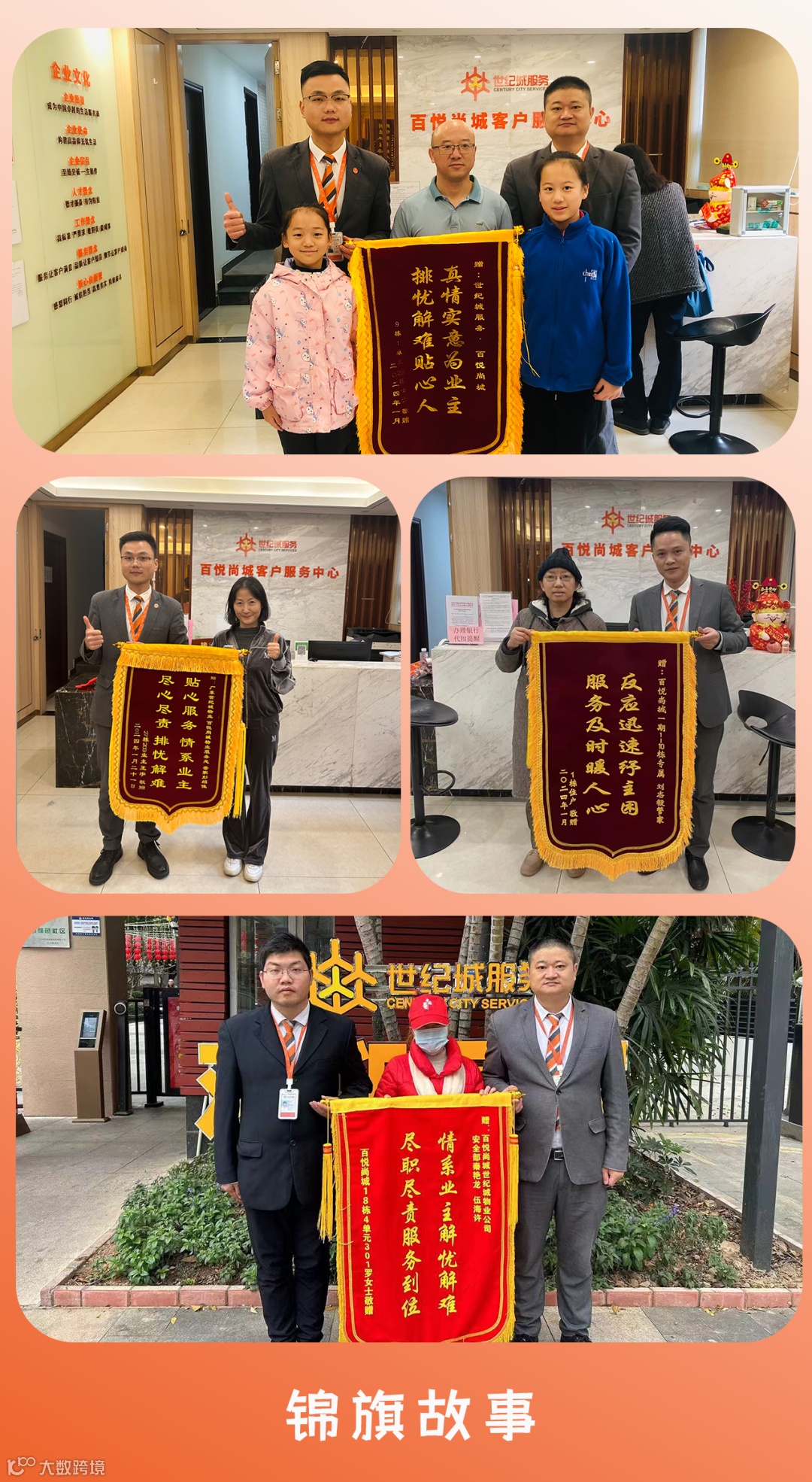 在世纪城服务进驻的这一年里,世纪城服务百悦尚城物业团队始终保持着不懈的努力与热情,从未有过丝毫懈怠。这份用心与坚持,如同温暖的阳光,悄无声息地渗透进每位业主的心田。我们的辛勤付出已赢得了众多业主的认可与赞赏,许多业主在服务中送来了锦旗。自进场以来,一共获得业主锦旗13面,表扬信2封。