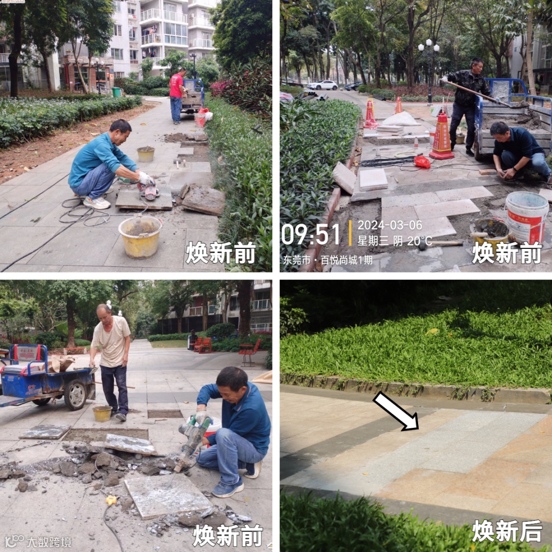 物业派遣专业团队对园区进行了细致的“美容术”,针对那些松动的地面砖与墙面砖,维修师傅们逐一排查,精准修复,共完成了612平方米地面砖的平整修复。每一寸破损,都在他们的巧手下重获新生,恢复了原有的平整与美观。