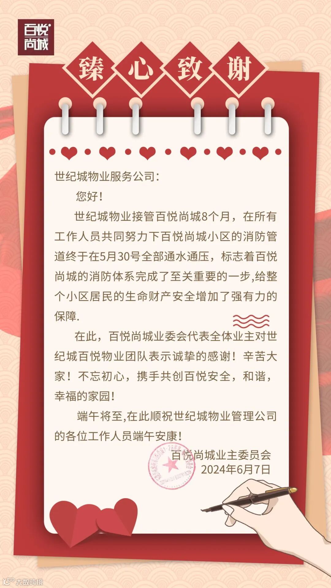 ▲百悦尚城业委会赠感谢信