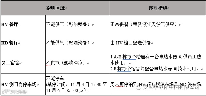 因新厂房电路安装检测需求,公司生活区域燃气将于2017年11月5日8:00至2017年11月6日8:00停止供应,停气期间主要影响区域及应对措施如下: