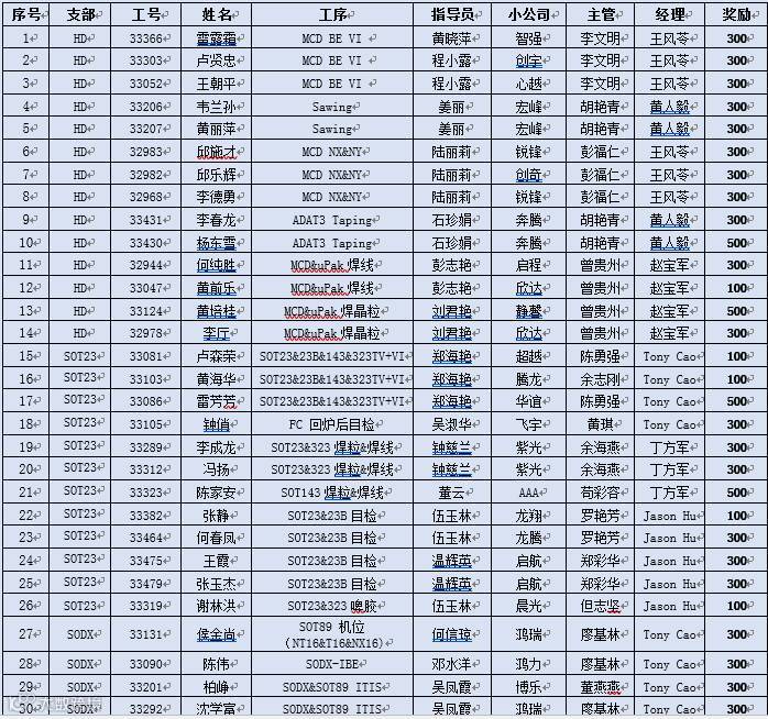 6月份获得A级(优秀)员工奖励者名单及奖励金额如下: