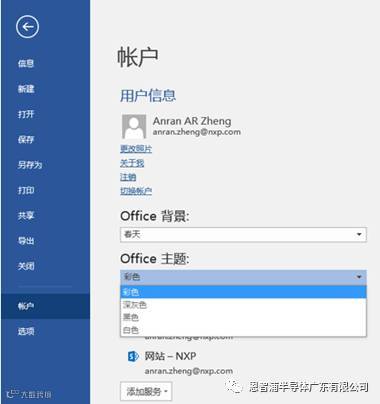 有四种可应用于 Office 的主题: 彩色、深灰色、黑色和白色。若要访问这些主题,可以点击文件>帐户,然后单击Office 主题旁边的下拉菜单。