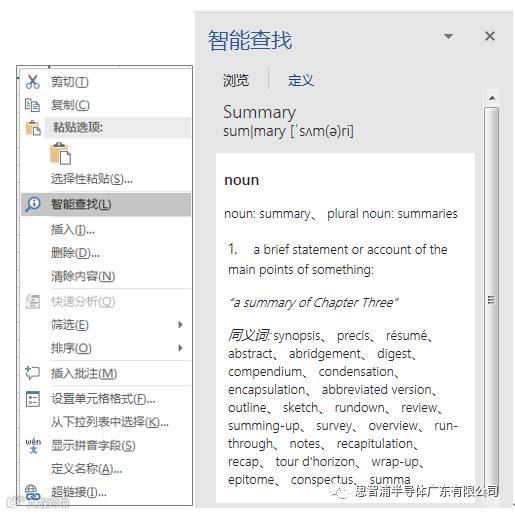 当你选择某个字词或短语、右键单击它,并选择智能查找,窗格将打开定义,定义来源于维基百科和网络相关搜索。