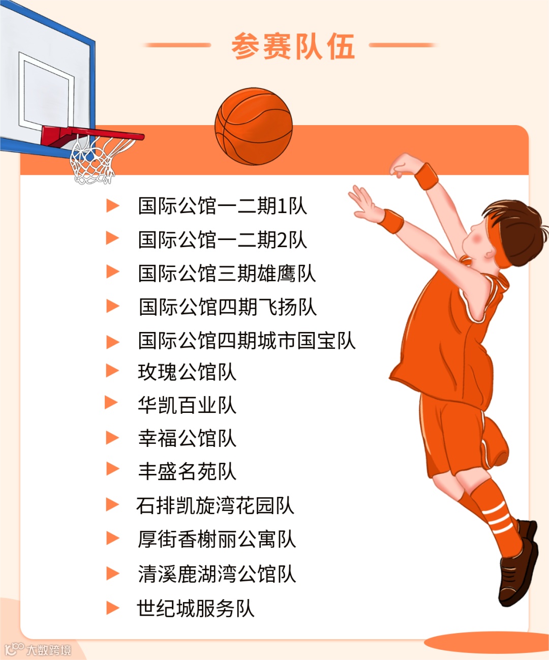 自2022年7月30日开赛以来,篮球争霸赛一直如火如荼开展,本次比赛一共有13支参赛队伍,他们分别是: