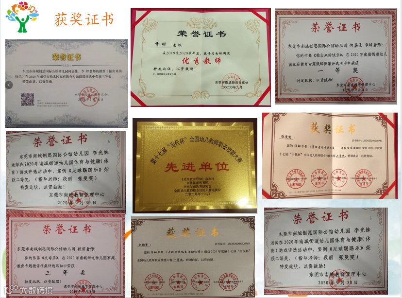 先后被评为东莞市一级幼儿园、广东学前教育专业委员会理事单位、广东省食品安全A级单位、东莞市民办教育协会会员单位、“有爱共融 放飞梦想”关爱特殊儿童活动爱心企业、荣获南城区保教质量评估一等奖、《3~6岁儿童学习与发展指南》知识大赛二等奖、历届毕业典礼荣获最佳魅力艺术奖、创意编排奖、最佳艺术表演奖、最佳艺术奖等等。