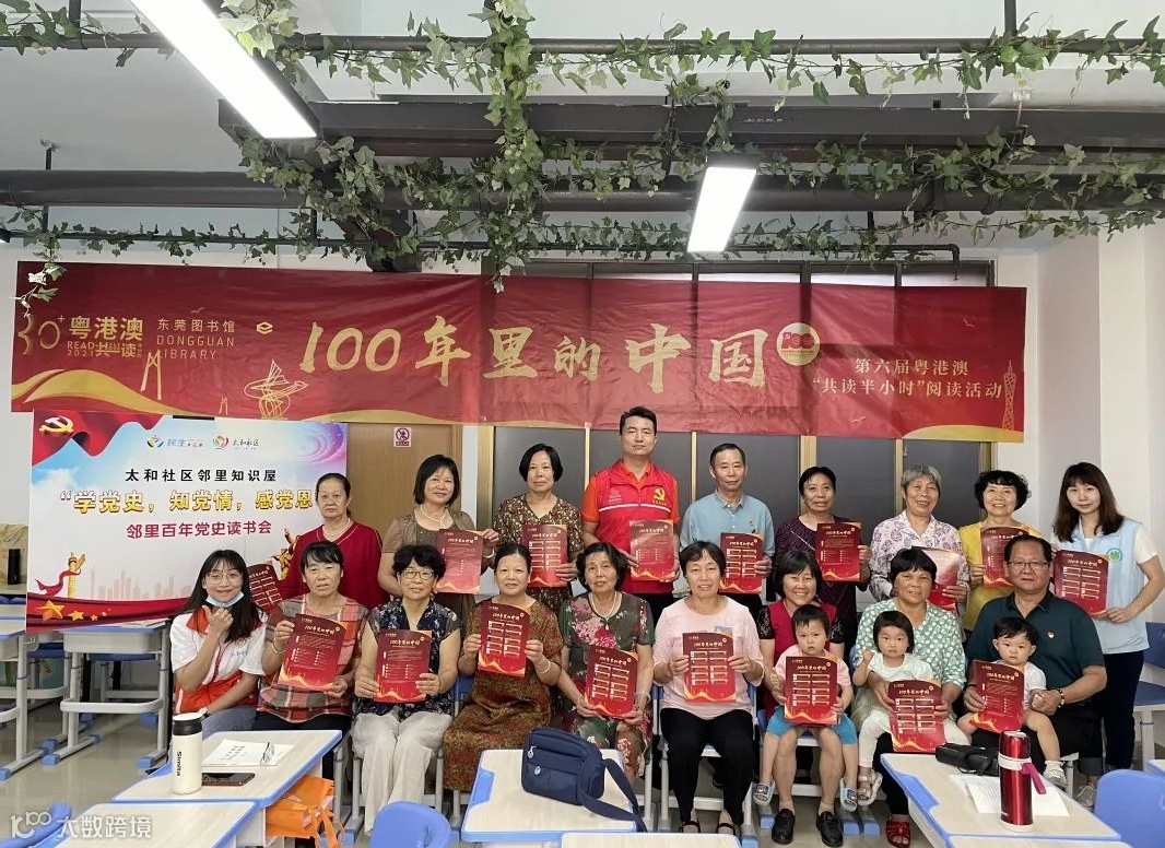 石排凯旋湾花园党支部&太和社区于“邻里汇”红色宣传阵地开展“学党史、知党情、感党恩”邻里百年读书会活动,让红色经典散发在社区居民中。