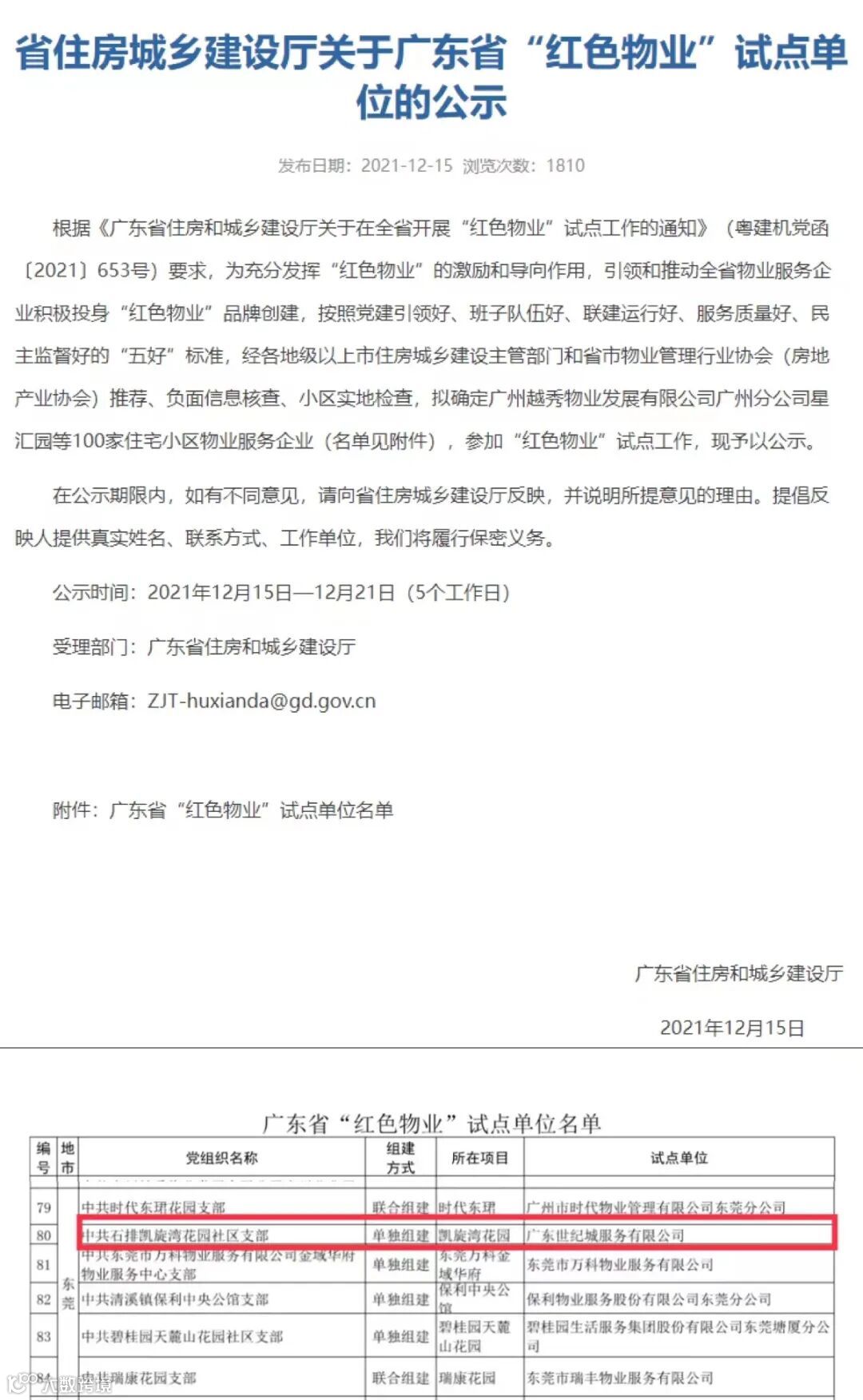 日前,广东省住房和城乡建设厅就拟定结果予以公示。广东世纪城服务有限公司旗下项目石排凯旋湾花园入选“广东省‘红色物业’试点单位名单(党组织名称:中共石排凯旋湾花园党支部)。这是上级部门及社区各界对世纪城服务高举党建引领、积极开展红色物业建设的鼓励,也是对世纪城服务创建红色物业思路和实践的肯定。