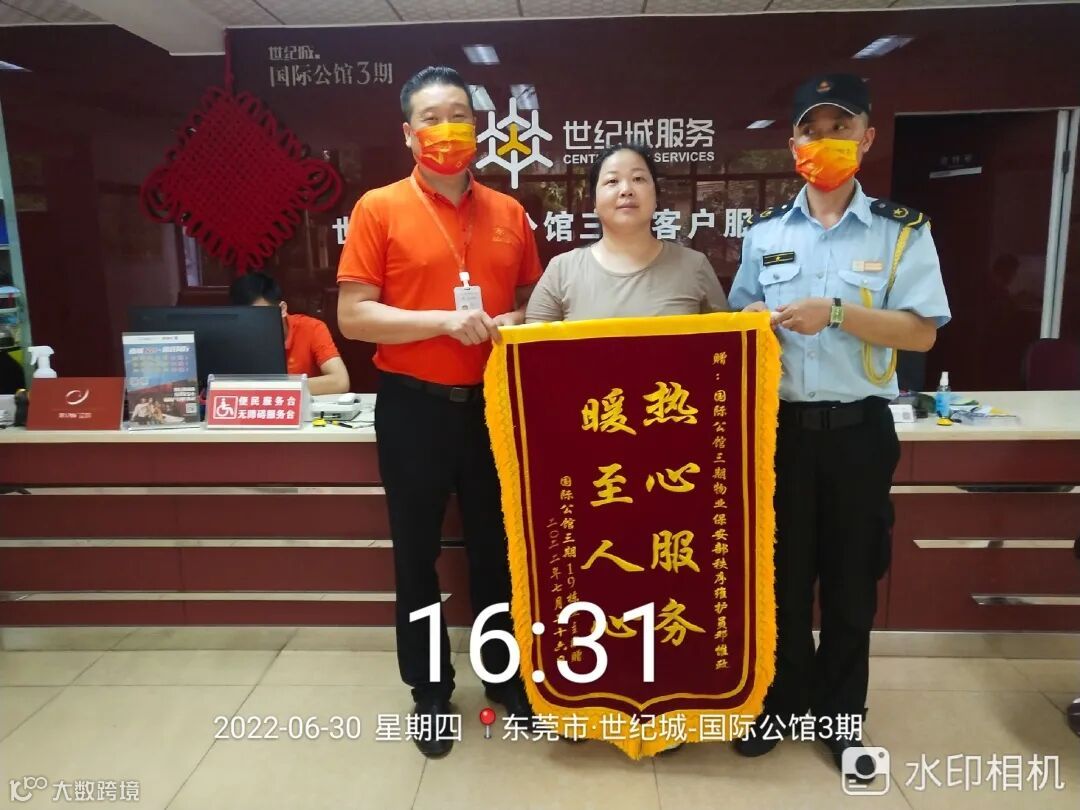 2022年6月30日下午,国际公馆三期服务中心收到19栋业户岳女士赠送一面写有“热心服务、暖至人心”的锦旗送到了物业服务处。业主特别感谢了秩序维护部邓惟政日常工作热心服务。