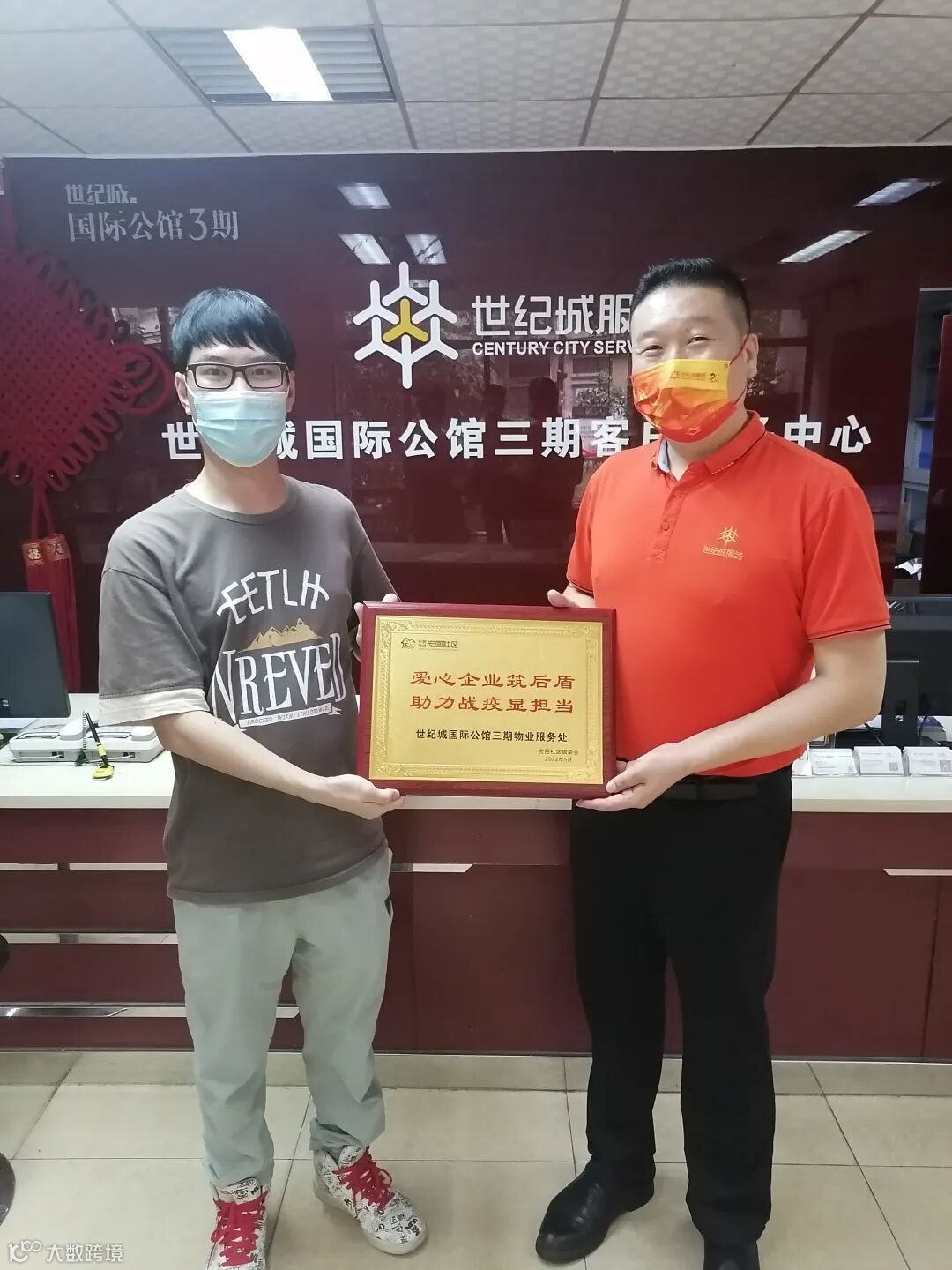 2022年6月27日下午16:00,南城宏图社区工作人员将一块写有“爱心企业筑后盾、助力战疫显担当”的荣誉奖牌送到世纪城国际公馆三期物业服务处。表彰国际公馆三期物业工作人员一直以来为疫情防控尽职尽责、勇于担当维护小区,全力确保每次大规模核酸检测工作顺利开展,受到宏图社区领导、工作人员和广大业户朋友们的一致好评。
