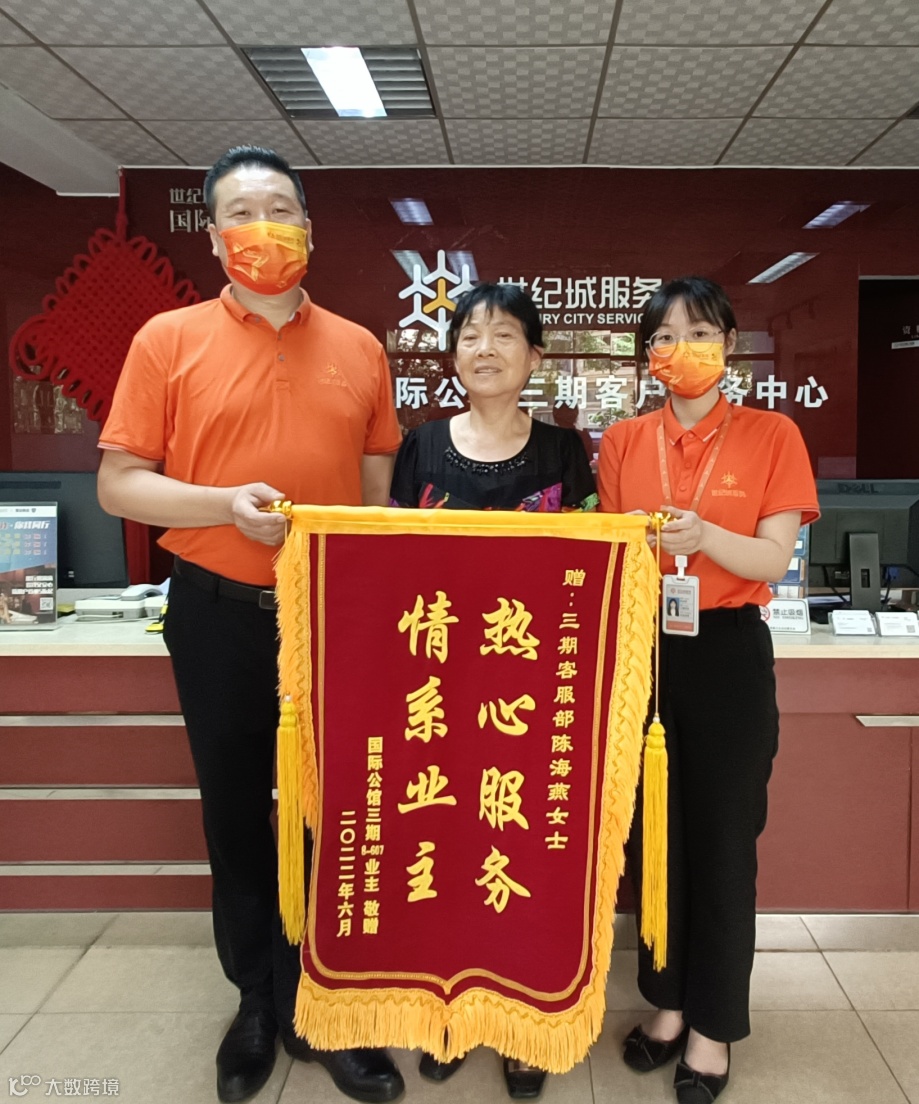2022年6月27日下午,国际公馆三期物业服务中心收到8栋607业户赠送一面写有“热心服务、情系业主”的锦旗送到了物业服务处。业主特别感谢了客服部陈海燕“热情服务、为业户排忧解难”的服务。