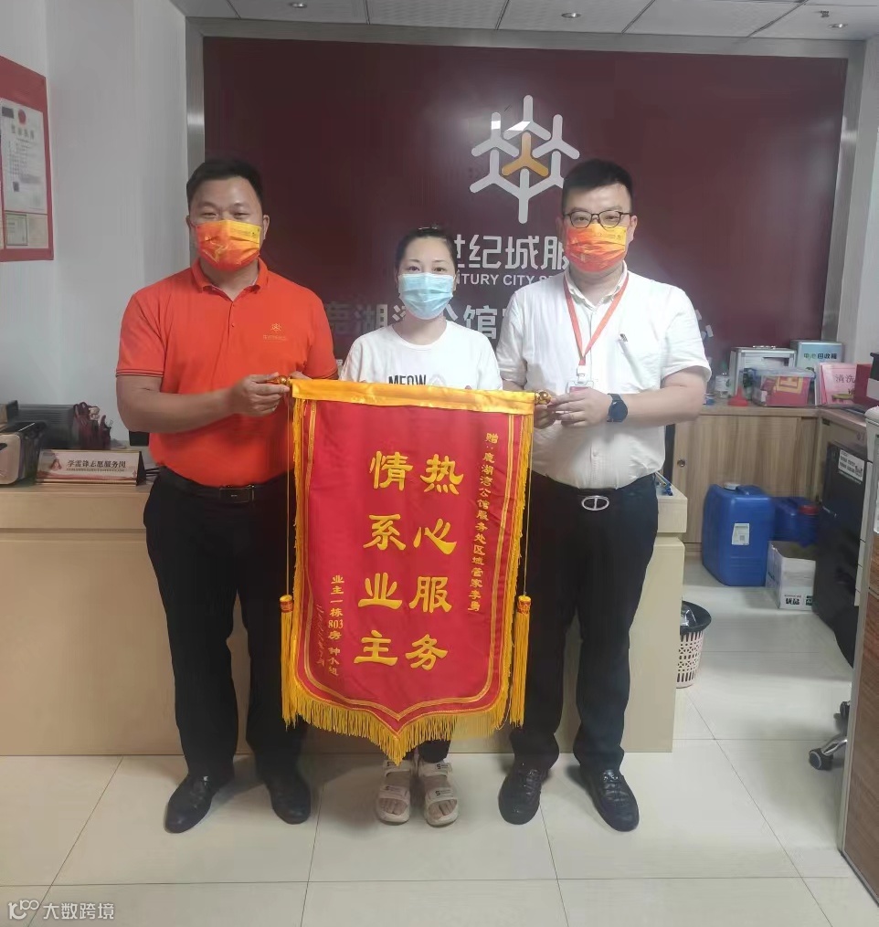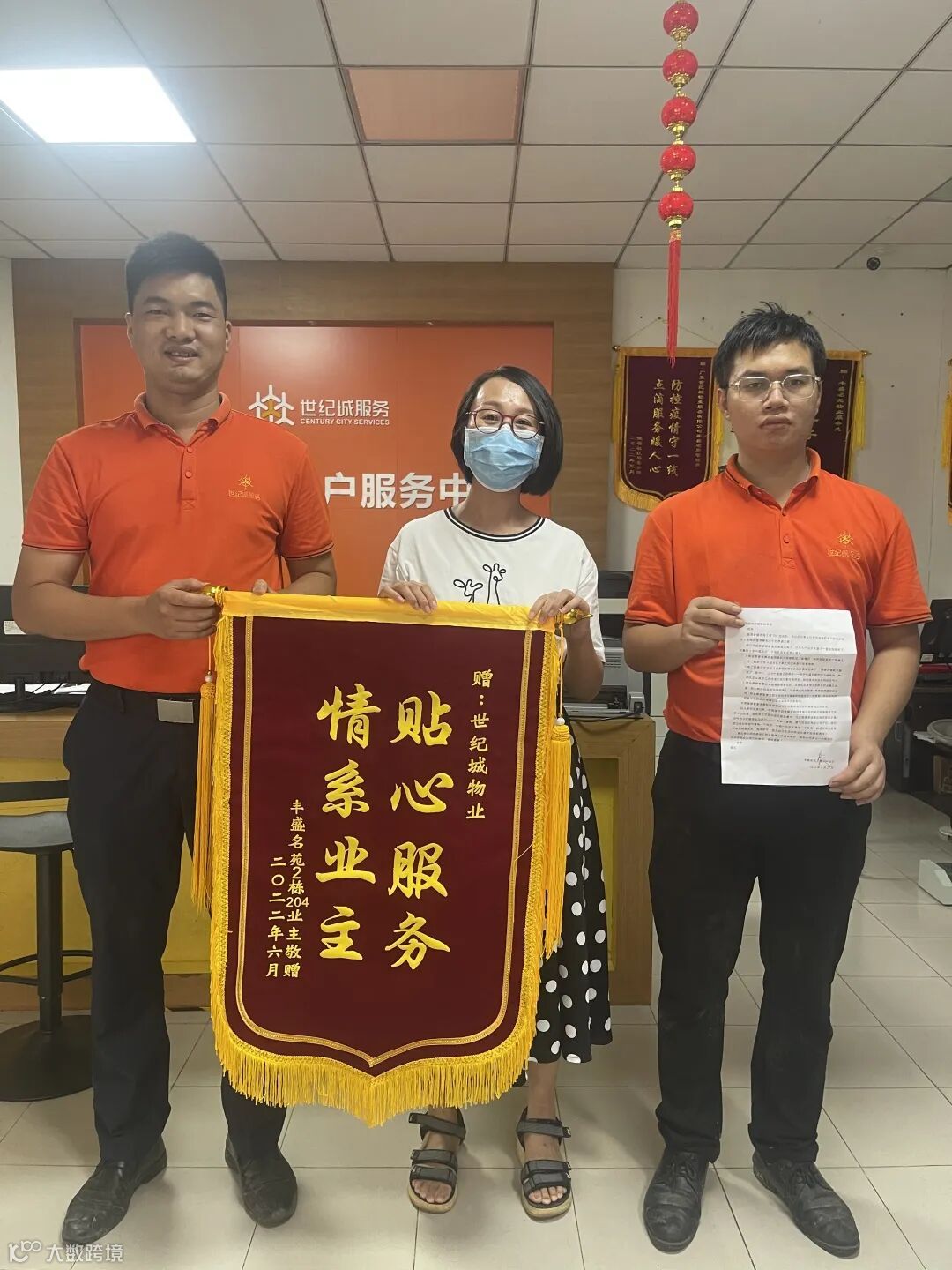 2022年7月6日下午,丰盛名苑服务中心收到2栋204业主送来一封感谢信和一面写有“贴心服务、情系业主”的锦旗送到了物业服务处,感谢物业辛苦付出。特别表扬了工程部主任王宁工作认真负责,专属管家李勇热情服务、为业户排忧解难,对丰盛名苑全体员工的服务态度给予了高度赞扬,同时也表达了对世纪城物业服务的高度认可。