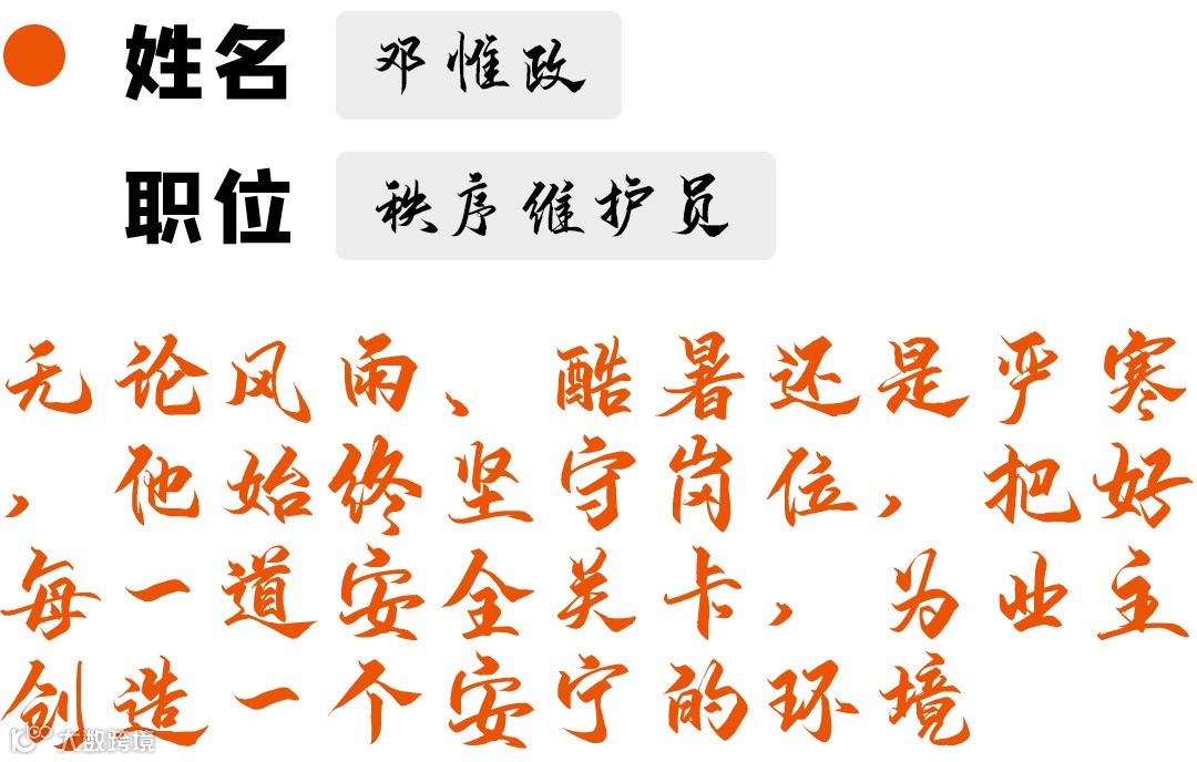 一套秩序制服,配上肩章,戴上黑色的帽子,一站就是12小时。邓惟政以高标准要求自己,按照公司工作流程,以最好的服务态度,做好每一个动作,每一个细节,将美好的一面呈现给他人。