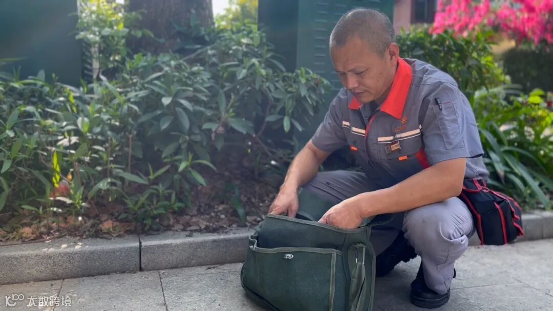 一个斜背大工具包,一个腰间小工具包,有时候还带一把铝梯,亦或是木梯,有时穿着帆布鞋,有时穿着高筒雨鞋,有这些装备,郭师傅就能在小区忙碌一整天。