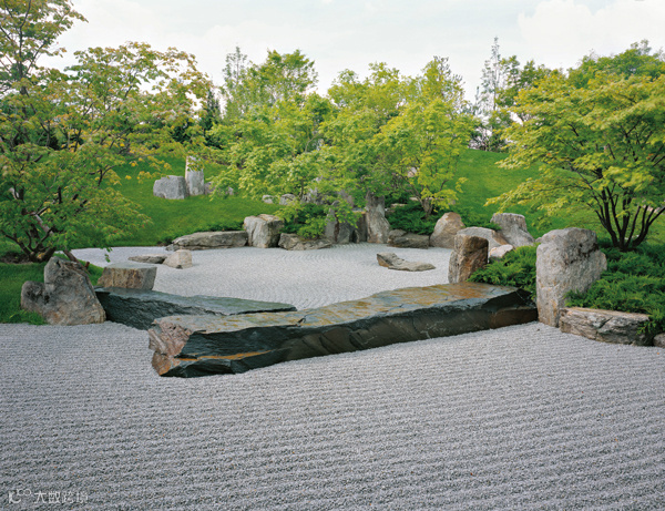 ▶ 枯山水,是源于日本的缩微式园林景观,多见于小巧、静谧、深邃的禅宗寺院。庭园设计开始会植入绿色的植物,后来,植物会慢慢枯掉,只剩下石头和白沙。在其特有的环境气氛中,细细耙制的白砂石铺地、叠放有致的几尊石组,就能对人的心境产生神奇的力量。