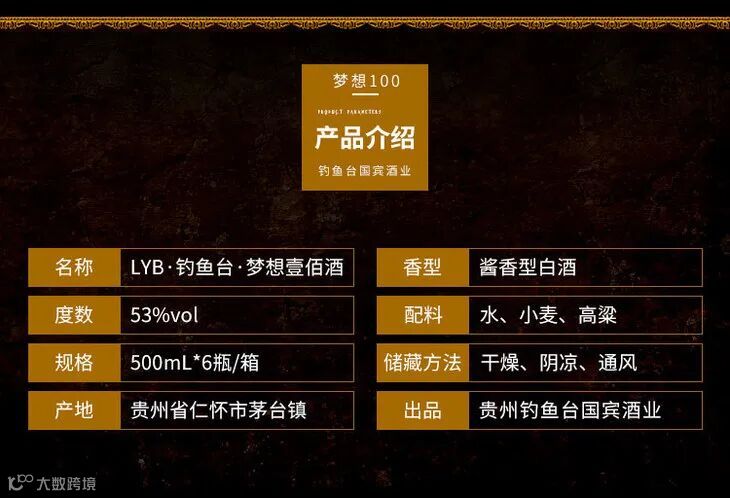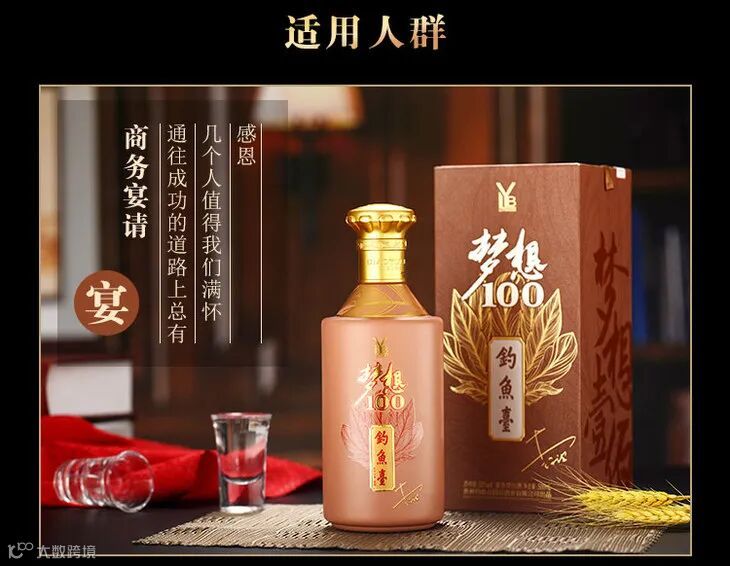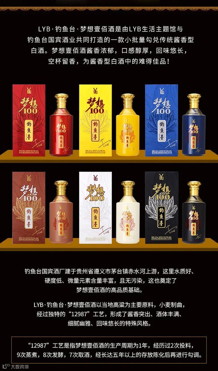 美丽的赤水河畔,诞生了“梦想壹佰酒”,LYB·钓鱼台·梦想壹佰酒为53°酱香型白酒,以茅台镇当地高粱为主要原料,以小麦制曲,经过独特的“12987”工艺,长达五年以上的存放陈化后再进行勾调,形成了酱香突出、酒体丰满、细腻幽雅、回味绵长的特殊风格。