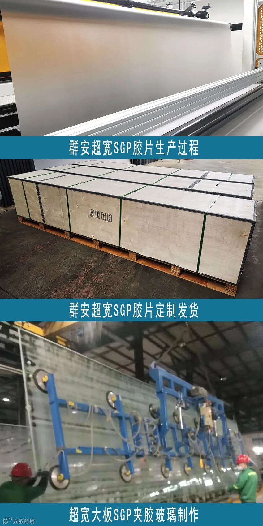 以往超宽SGP夹胶玻璃的制作工艺是需要用SGP胶片进行拼接,工艺难度要求极高,容易造成胶片拼接处错位产生线状气泡或者出现拼接痕迹。超宽SGP胶片带来的好处是操作工艺简单且有效避免上述的技术问题,给夹胶生产带来便捷。