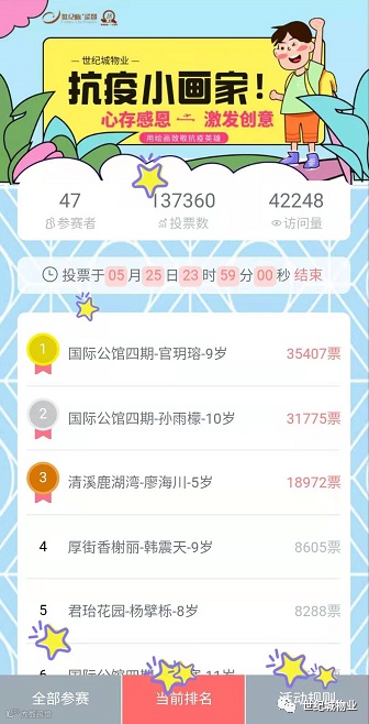 战疫小画家的活动已经圆满结束,对应的奖状礼品由各服务处协助联系颁发,感谢所有的选手的踊跃参与,希望各位小朋友能够在这次活动中有所收获,懂得感恩,树立正面积极的价值观,世纪城物业会继续努力,举办这类有意义的社区活动。