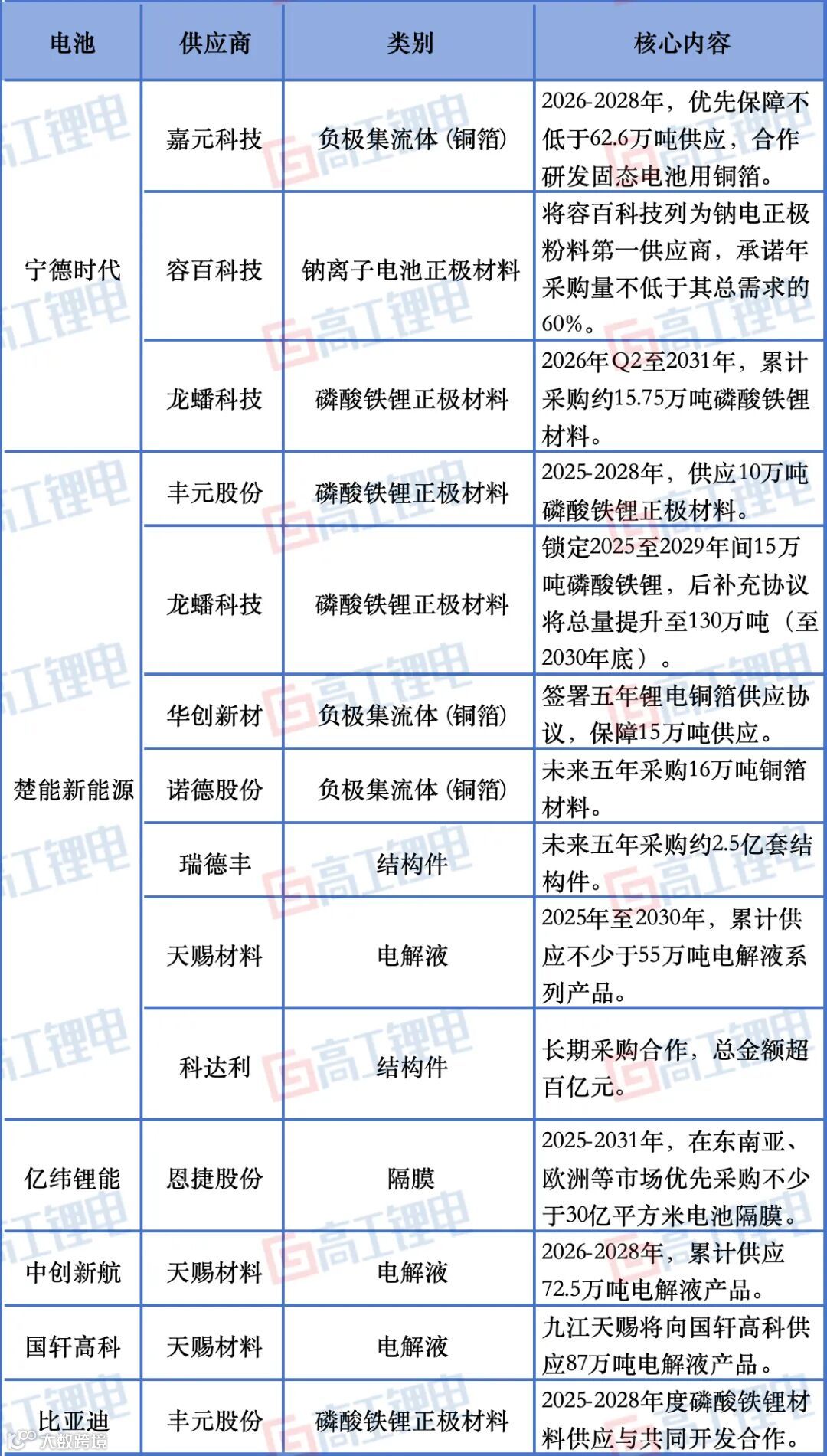 行业的这一共识已迅速转化为具体行动。2025年以来,头部电池企业掀起了一场锁定上游核心资源的“长单潮”,其范围之广、金额之大、绑定之深,均属空前。