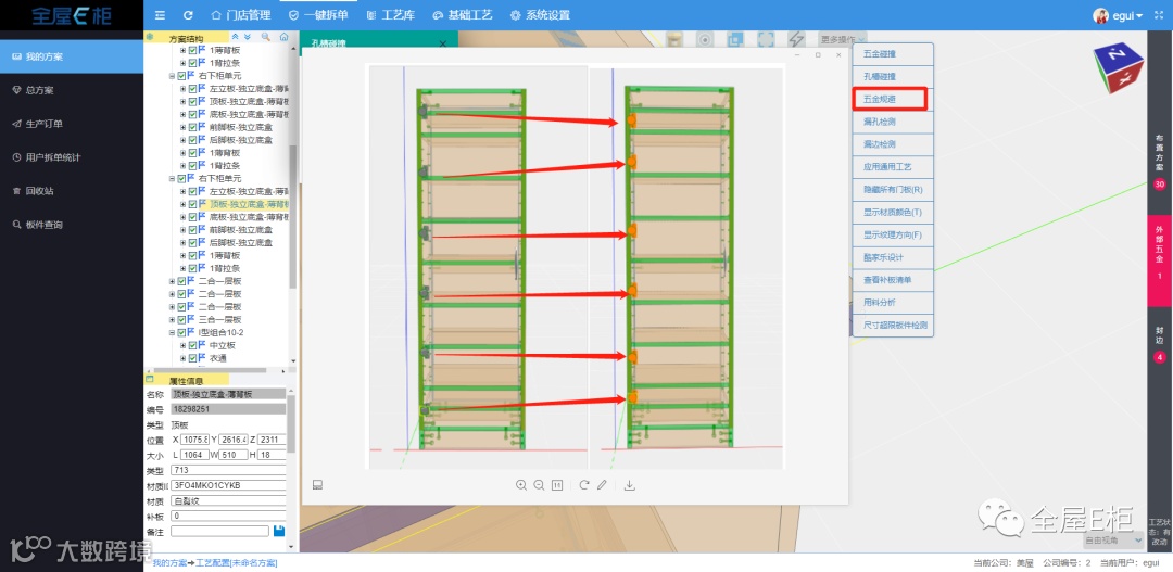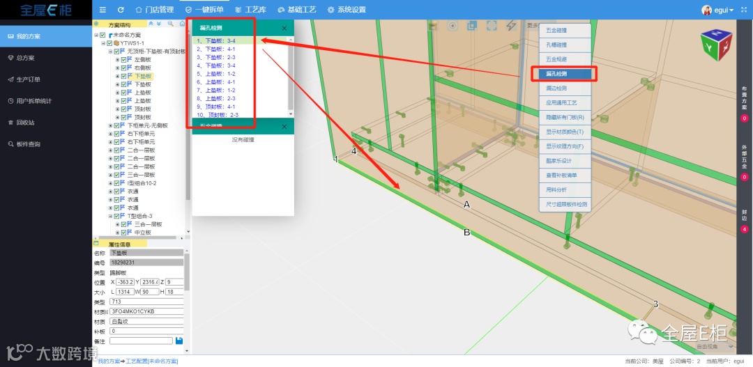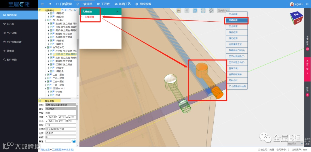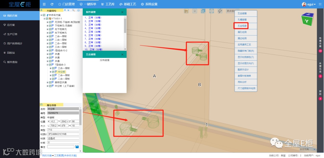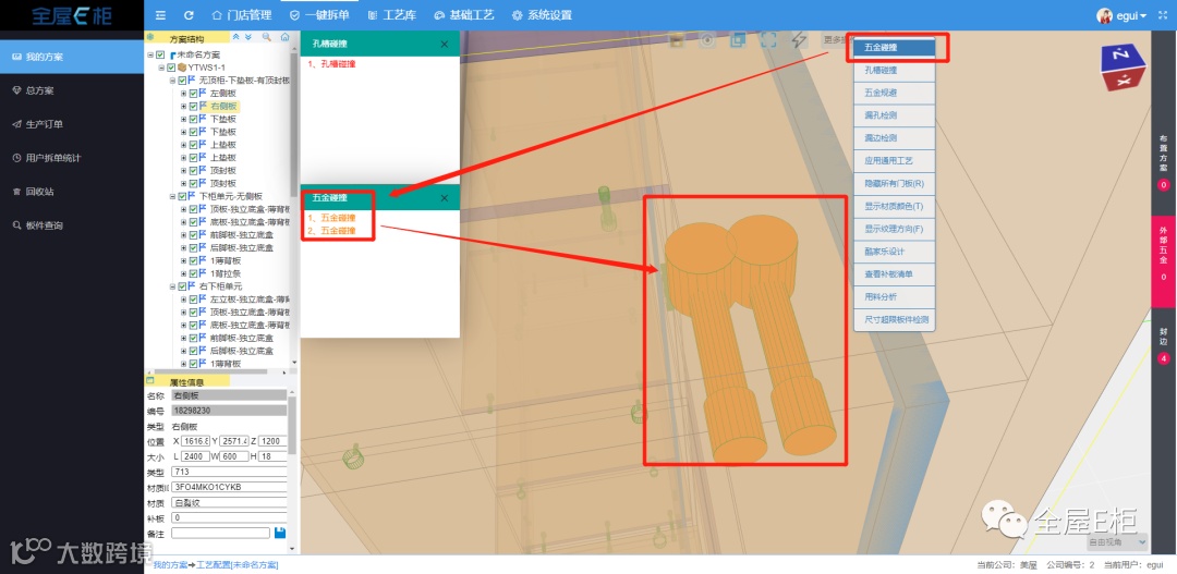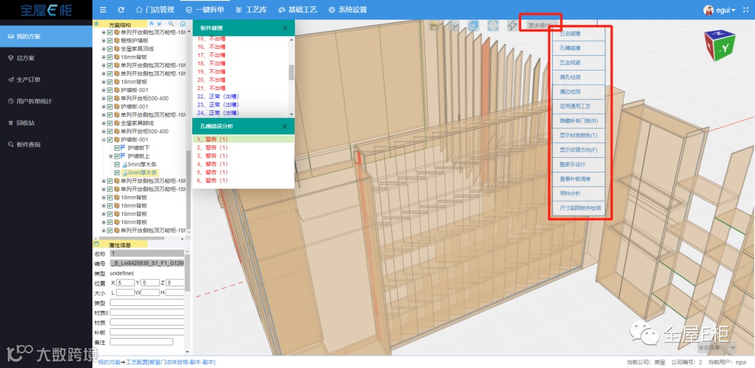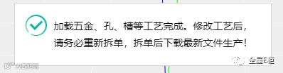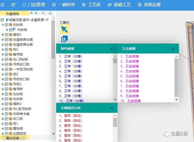 加载完后,系统会自动检测:板件碰撞、五金碰撞、孔槽错误分析,并相对于弹窗提示。如有提示,应重点逐一审核检查,如是设计问题则建议退回设计师修改,如是基础工艺配置问题则反馈工艺管理人员修改工艺规则,如只是当前方案的部分工艺有问题,则可以在当前审核工艺中修改。