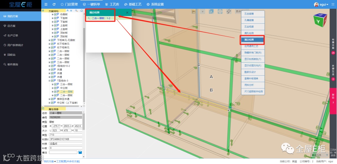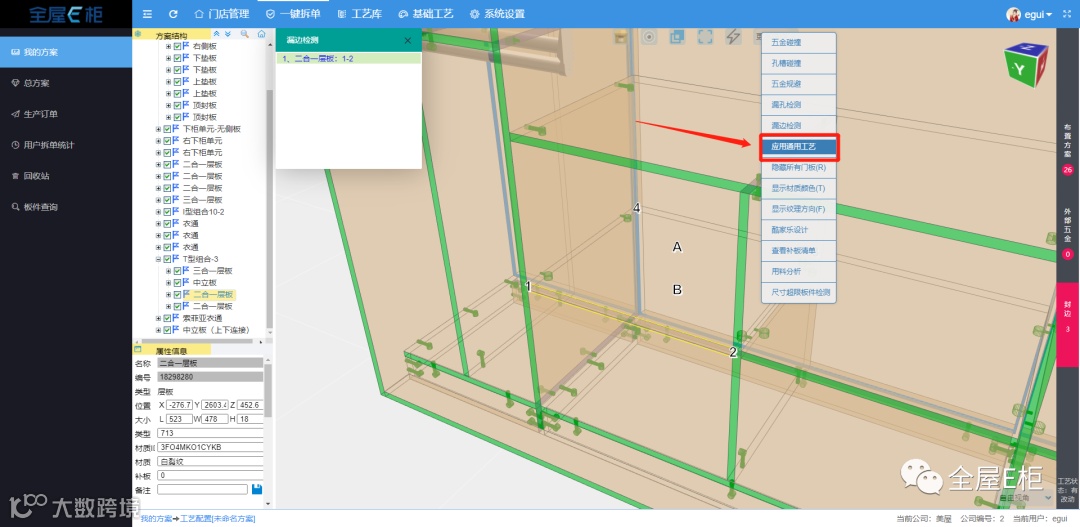 如有很多板件需要添加布置方案、封边等,除了手动单块板、单条边配置外,还可以应用通用工艺选择柜体批量自动碰撞