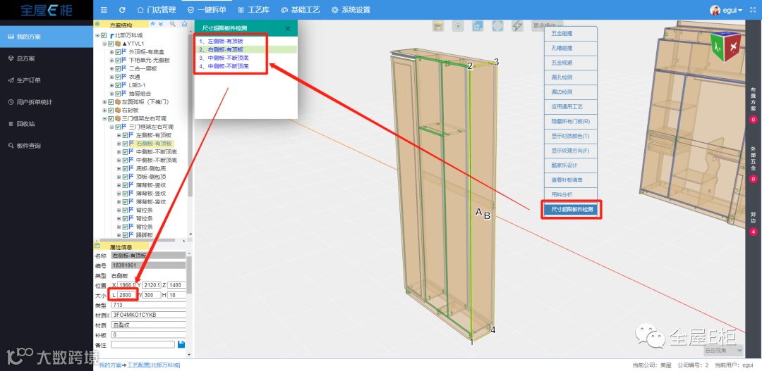 为避免设计时超过原材料尺寸的板件出现,在审核工艺中可以检测尺寸超限板件;